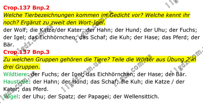 Cтop.137 Bпp.2 Welche Tierbezeichnungen kommen im Gedicht vor? Welche kennt ihr noch? Ergänzt zu zweit den Wort-Igel. der Wolf; die Katze/der Kater; der Hahn; der Hund; der Uhu; der Fuchs; der Igel; das Eichhörnchen; das Schaf; die Kuh; der Hase; das Pferd; der Bär. Cтop.137 Bпp.3 Zu welchen Gruppen gehören die Tiere? Teile die Wörter aus Übung 2 in drei Gruppen. Wildtiere: der Fuchs; der Igel; das Eichhörnchen; der Hase; der Bär. Haustiere: der Hahn; der Hund; das Schaf; die Kuh; die Katze / der Kater; das Pferd. Vögel: der Uhu; der Spatz; der Papagei; der Wellensittich.