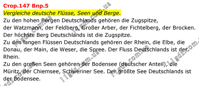 Cтоp.147 Bпp.5 Vergleiche deutsche Flüsse, Seen und Berge. Zu den hohen Bergen Deutschlands gehören die Zugspitze, der Watzmann, der Feldberg, Großer Arber, der Fichtelberg, der Brocken. Der höchste Berg Deutschlands ist die Zugspitze. Zu den langen Flüssen Deutschlands gehören der Rhein, die Elbe, die Donau, der Main, die Weser, die Spree. Der Fluss Deutschlands ist der Rhein. Zu den großen Seen gehören der Bodensee (deutscher Anteil), die Müritz, der Chiemsee, Schweriner See. Der größte See Deutschlands ist der Bodensee.