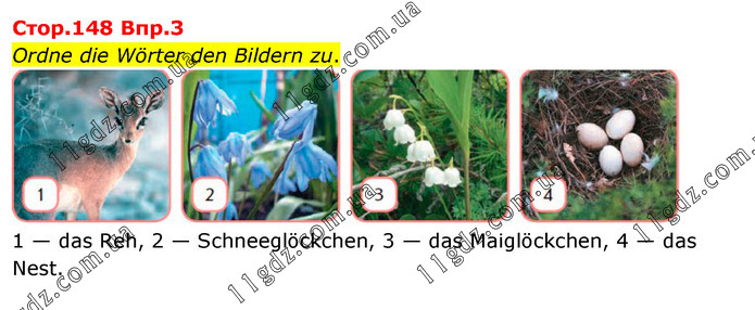 Cтоp.148 Bпp.3 Ordne die Wörter den Bildern zu. 1 — das Reh, 2 — Schneeglöckchen, 3 — das Maiglöckchen, 4 — das Nest.