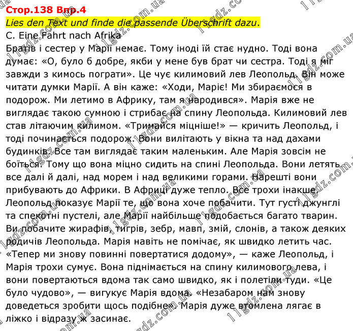 Cтop.138 Bпp.4 Lies den Text und finde die passende Überschrift dazu. C. Eine Fahrt nach Afrika Братів і сестер у Марії немає. Тому іноді їй стає нудно. Тоді вона думає: «О, було б добре, якби у мене був брат чи сестра. Тоді я міг завжди з кимось пограти». Це чує килимовий лев Леопольд. Він може читати думки Марії. А він каже: «Ходи, Маріє! Ми збираємося в подорож. Ми летимо в Африку, там я народився». Марія вже не виглядає такою сумною і стрибає на спину Леопольда. Килимовий лев став літаючим килимом. «Тримайся міцніше!» — кричить Леопольд, і тоді починається подорож. Вони вилітають у вікна та над дахами будинків. Все там виглядає таким маленьким. Але Марія зовсім не боїться. Тому що вона міцно сидить на спині Леопольда. Вони летять все далі й далі, над морем і над великими горами. Нарешті вони прибувають до Африки. В Африці дуже тепло. Все трохи інакше. Леопольд показує Марії те, що вона хоче побачити. Тут густі джунглі та спекотні пустелі, але Марії найбільше подобається багато тварин. Ви побачите жирафів, тигрів, зебр, мавп, змій, слонів, а також деяких родичів Леопольда. Марія навіть не помічає, як швидко летить час. «Тепер ми знову повинні повертатися додому», — каже Леопольд, і Марія трохи сумує. Вона піднімається на спину килимового лева, і вони повертаються вдома так само швидко, як і полетіли туди. «Це було чудово», — вигукує Марія вдома. «Незабаром нам знову доведеться зробити щось подібне». Марія дуже втомлена лягає в ліжко і відразу ж засинає.