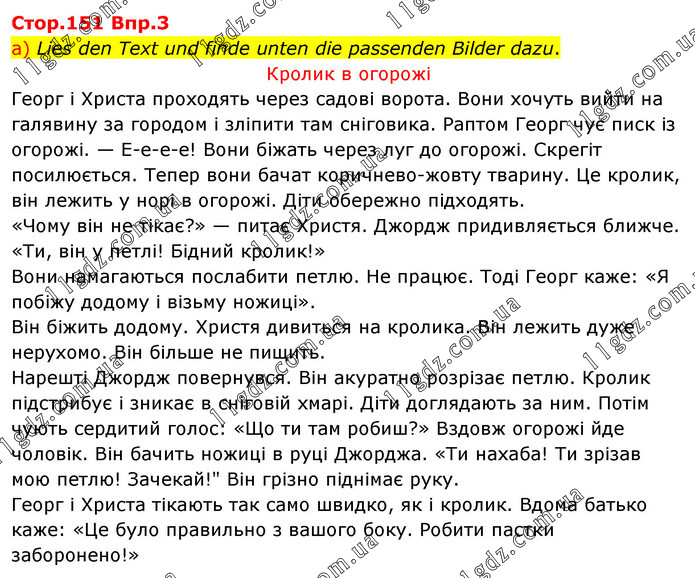 Стор.151 Впр.3 a) Lies den Text und finde unten die passenden Bilder dazu. Кролик в огорожі Георг і Христа проходять через садові ворота. Вони хочуть вийти на галявину за городом і зліпити там сніговика. Раптом Георг чує писк із огорожі. — Е-е-е-е! Вони біжать через луг до огорожі. Скрегіт посилюється. Тепер вони бачат коричнево-жовту тварину. Це кролик, він лежить у норі в огорожі. Діти обережно підходять. «Чому він не тікає?» — питає Христя. Джордж придивляється ближче. «Ти, він у петлі! Бідний кролик!» Вони намагаються послабити петлю. Не працює. Тоді Георг каже: «Я побіжу додому і візьму ножиці». Він біжить додому. Христя дивиться на кролика. Він лежить дуже нерухомо. Він більше не пищить. Нарешті Джордж повернувся. Він акуратно розрізає петлю. Кролик підстрибує і зникає в сніговій хмарі. Діти доглядають за ним. Потім чують сердитий голос: «Що ти там робиш?» Вздовж огорожі йде чоловік. Він бачить ножиці в руці Джорджа. «Ти нахаба! Ти зрізав мою петлю! Зачекай!" Він грізно піднімає руку. Георг і Христа тікають так само швидко, як і кролик. Вдома батько каже: «Це було правильно з вашого боку. Робити пастки заборонено!»