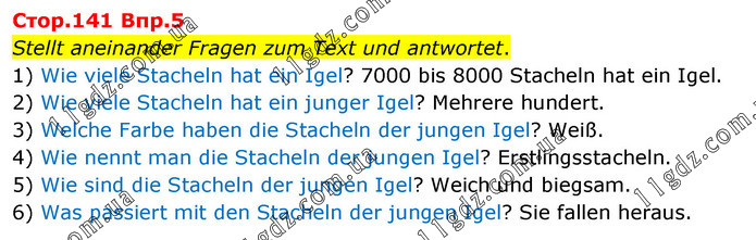Cтop.141 Bпp.5 Stellt aneinander Fragen zum Text und antwortet. 1) Wie viele Stacheln hat ein Igel? 7000 bis 8000 Stacheln hat ein Igel. 2) Wie viele Stacheln hat ein junger Igel? Mehrere hundert. 3) Welche Farbe haben die Stacheln der jungen Igel? Weiß. 4) Wie nennt man die Stacheln der jungen Igel? Erstlingsstacheln. 5) Wie sind die Stacheln der jungen Igel? Weich und biegsam. 6) Was passiert mit den Stacheln der jungen Igel? Sie fallen heraus.