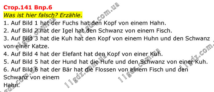 Cтop.141 Bпp.6 Was ist hier falsch? Erzähle. 1. Auf Bild 1 hat der Fuchs hat den Kopf von einem Hahn. 2. Auf Bild 2 hat der Igel hat den Schwanz von einem Fisch. 3. Auf Bild 3 hat die Kuh hat den Kopf von einem Huhn und den Schwanz von einer Katze. 4. Auf Bild 4 hat der Elefant hat den Kopf von einer Kuh. 5. Auf Bild 5 hat der Hund hat die Hufe und den Schwanz von einer Kuh. 6. Auf Bild 6 hat der Bär hat die Flossen von einem Fisch und den Schwanz von einem Hahn.