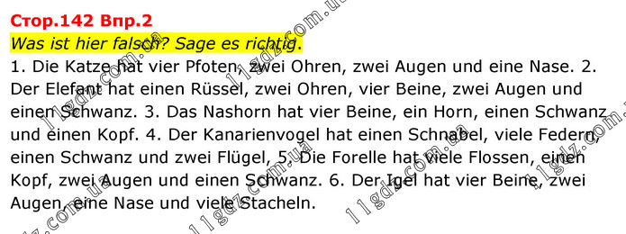 Стор.142 Впр.2 Was ist hier falsch? Sage es richtig. 1. Die Katze hat vier Pfoten, zwei Ohren, zwei Augen und eine Nase. 2. Der Elefant hat einen Rüssel, zwei Ohren, vier Beine, zwei Augen und einen Schwanz. 3. Das Nashorn hat vier Beine, ein Horn, einen Schwanz und einen Kopf. 4. Der Kanarienvogel hat einen Schnabel, viele Federn, einen Schwanz und zwei Flügel, 5. Die Forelle hat viele Flossen, einen Kopf, zwei Augen und einen Schwanz. 6. Der Igel hat vier Beine, zwei Augen, eine Nase und viele Stacheln.