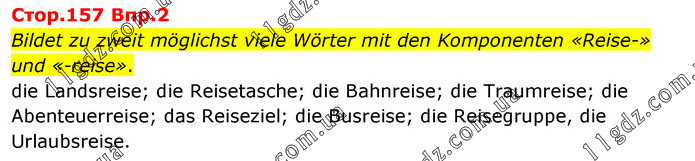 Стор.157 Впр.2 Bildet zu zweit möglichst viele Wörter mit den Komponenten «Reise-» und «-reise». die Landsreise; die Reisetasche; die Bahnreise; die Traumreise; die Abenteuerreise; das Reiseziel; die Busreise; die Reisegruppe, die Urlaubsreise.