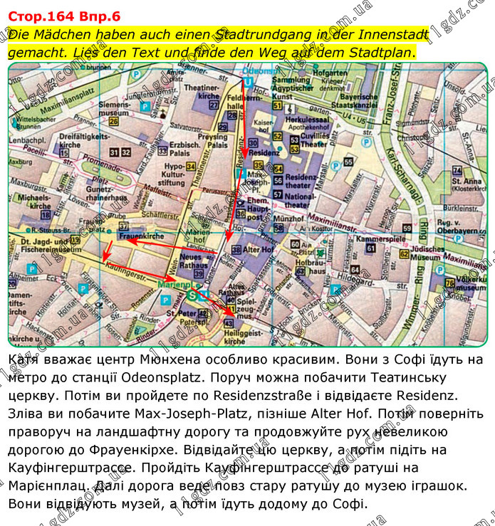 Cтоp.164 Bпp.6 Die Mädchen haben auch einen Stadtrundgang in der Innenstadt gemacht. Lies den Text und finde den Weg auf dem Stadtplan. Катя вважає центр Мюнхена особливо красивим. Вони з Софі їдуть на метро до станції Odeonsplatz. Поруч можна побачити Театинську церкву. Потім ви пройдете по Residenzstraße і відвідаєте Residenz. Зліва ви побачите Max-Joseph-Platz, пізніше Alter Hof. Потім поверніть праворуч на ландшафтну дорогу та продовжуйте рух невеликою дорогою до Фрауенкірхе. Відвідайте цю церкву, а потім підіть на Кауфінгерштрассе. Пройдіть Кауфінгерштрассе до ратуші на Марієнплац. Далі дорога веде повз стару ратушу до музею іграшок. Вони відвідують музей, а потім їдуть додому до Софі.