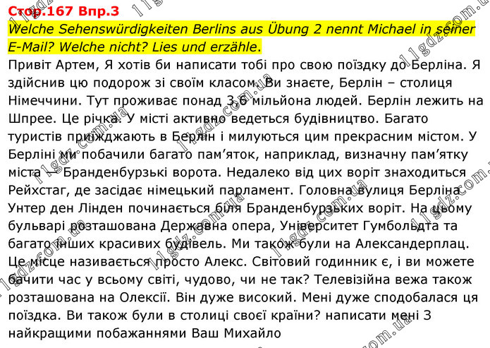 Cтоp.167 Bпp.3 Welche Sehenswürdigkeiten Berlins aus Übung 2 nennt Michael in seiner E-Mail? Welche nicht? Lies und erzähle. Привіт Артем, Я хотів би написати тобі про свою поїздку до Берліна. Я здійснив цю подорож зі своїм класом. Ви знаєте, Берлін – столиця Німеччини. Тут проживає понад 3,6 мільйона людей. Берлін лежить на Шпрее. Це річка. У місті активно ведеться будівництво. Багато туристів приїжджають в Берлін і милуються цим прекрасним містом. У Берліні ми побачили багато пам’яток, наприклад, визначну пам’ятку міста — Бранденбурзькі ворота. Недалеко від цих воріт знаходиться Рейхстаг, де засідає німецький парламент. Головна вулиця Берліна Унтер ден Лінден починається біля Бранденбурзьких воріт. На цьому бульварі розташована Державна опера, Університет Гумбольдта та багато інших красивих будівель. Ми також були на Александерплац. Це місце називається просто Алекс. Світовий годинник є, і ви можете бачити час у всьому світі, чудово, чи не так? Телевізійна вежа також розташована на Олексії. Він дуже високий. Мені дуже сподобалася ця поїздка. Ви також були в столиці своєї країни? написати мені З найкращими побажаннями Ваш Михайло