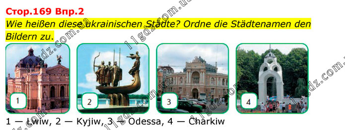 Cтоp.169 Bпp.2 Wie heißen diese ukrainischen Städte? Ordne die Städtenamen den Bildern zu. 1 — Lwiw, 2 — Kyjiw, 3 — Odessa, 4 — Charkiw