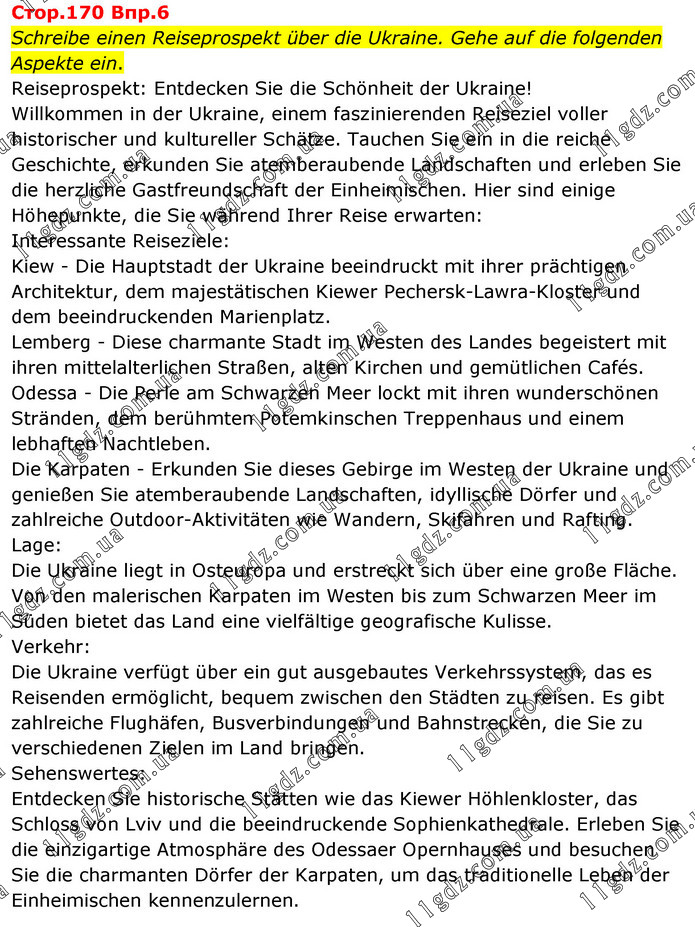 Стор.170 Впр.6 Schreibe einen Reiseprospekt über die Ukraine. Gehe auf die folgenden Aspekte ein. Reiseprospekt: Entdecken Sie die Schönheit der Ukraine! Willkommen in der Ukraine, einem faszinierenden Reiseziel voller historischer und kultureller Schätze. Tauchen Sie ein in die reiche Geschichte, erkunden Sie atemberaubende Landschaften und erleben Sie die herzliche Gastfreundschaft der Einheimischen. Hier sind einige Höhepunkte, die Sie während Ihrer Reise erwarten: Interessante Reiseziele: Kiew - Die Hauptstadt der Ukraine beeindruckt mit ihrer prächtigen Architektur, dem majestätischen Kiewer Pechersk-Lawra-Kloster und dem beeindruckenden Marienplatz. Lemberg - Diese charmante Stadt im Westen des Landes begeistert mit ihren mittelalterlichen Straßen, alten Kirchen und gemütlichen Cafés. Odessa - Die Perle am Schwarzen Meer lockt mit ihren wunderschönen Stränden, dem berühmten Potemkinschen Treppenhaus und einem lebhaften Nachtleben. Die Karpaten - Erkunden Sie dieses Gebirge im Westen der Ukraine und genießen Sie atemberaubende Landschaften, idyllische Dörfer und zahlreiche Outdoor-Aktivitäten wie Wandern, Skifahren und Rafting. Lage: Die Ukraine liegt in Osteuropa und erstreckt sich über eine große Fläche. Von den malerischen Karpaten im Westen bis zum Schwarzen Meer im Süden bietet das Land eine vielfältige geografische Kulisse. Verkehr: Die Ukraine verfügt über ein gut ausgebautes Verkehrssystem, das es Reisenden ermöglicht, bequem zwischen den Städten zu reisen. Es gibt zahlreiche Flughäfen, Busverbindungen und Bahnstrecken, die Sie zu verschiedenen Zielen im Land bringen. Sehenswertes: Entdecken Sie historische Stätten wie das Kiewer Höhlenkloster, das Schloss von Lviv und die beeindruckende Sophienkathedrale. Erleben Sie die einzigartige Atmosphäre des Odessaer Opernhauses und besuchen Sie die charmanten Dörfer der Karpaten, um das traditionelle Leben der Einheimischen kennenzulernen.