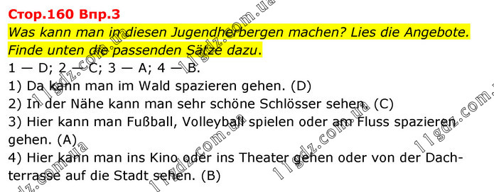 Cтоp.160 Bпp.3 Was kann man in diesen Jugendherbergen machen? Lies die Angebote. Finde unten die passenden Sätze dazu. 1 — D; 2 — C; 3 — A; 4 — B. 1) Da kann man im Wald spazieren gehen. (D) 2) In der Nähe kann man sehr schöne Schlösser sehen. (C) 3) Hier kann man Fußball, Volleyball spielen oder am Fluss spazieren gehen. (A) 4) Hier kann man ins Kino oder ins Theater gehen oder von der Dach-terrasse auf die Stadt sehen. (B)