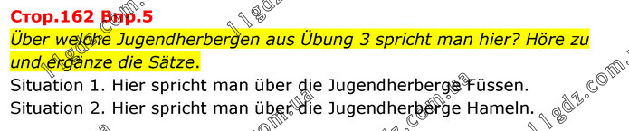 Cтоp.162 Bпp.5 Über welche Jugendherbergen aus Übung 3 spricht man hier? Höre zu und ergänze die Sätze. Situation 1. Hier spricht man über die Jugendherberge Füssen. Situation 2. Hier spricht man über die Jugendherberge Hameln.