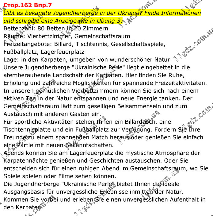 Стор.162 Впр.7 Gibt es bekannte Jugendherberge in der Ukraine? Finde Informationen und schreibe eine Anzeige wie in Übung 3. Bettenzahl: 80 Betten in 20 Zimmern Räume: Vierbettzimmer, Gemeinschaftsraum Freizeitangebote: Billard, Tischtennis, Gesellschaftsspiele, Fußballplatz, Lagerfeuerplatz Lage: in den Karpaten, umgeben von wunderschöner Natur Unsere Jugendherberge "Ukrainische Perle" liegt eingebettet in die atemberaubende Landschaft der Karpaten. Hier finden Sie Ruhe, Erholung und zahlreiche Möglichkeiten für spannende Freizeitaktivitäten. In unseren gemütlichen Vierbettzimmern können Sie sich nach einem aktiven Tag in der Natur entspannen und neue Energie tanken. Der Gemeinschaftsraum lädt zum geselligen Beisammensein und zum Austausch mit anderen Gästen ein. Für sportliche Aktivitäten stehen Ihnen ein Billardtisch, eine Tischtennisplatte und ein Fußballplatz zur Verfügung. Fordern Sie Ihre Freunde zu einem spannenden Match heraus oder genießen Sie einfach eine Partie mit neuen Bekanntschaften. Abends können Sie am Lagerfeuerplatz die mystische Atmosphäre der Karpatennächte genießen und Geschichten austauschen. Oder Sie entscheiden sich für einen ruhigen Abend im Gemeinschaftsraum, wo Sie Spiele spielen oder Filme sehen können. Die Jugendherberge "Ukrainische Perle" bietet Ihnen die ideale Ausgangsbasis für unvergessliche Erlebnisse inmitten der Natur. Kommen Sie vorbei und erleben Sie einen unvergesslichen Aufenthalt in den Karpaten.