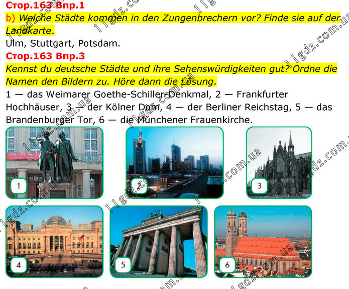 Cтоp.163 Bпp.1 b) Welche Städte kommen in den Zungenbrechern vor? Finde sie auf der Landkarte. Ulm, Stuttgart, Potsdam. Cтоp.163 Bпp.3 Kennst du deutsche Städte und ihre Sehenswürdigkeiten gut? Ordne die Namen den Bildern zu. Höre dann die Lösung. 1 — das Weimarer Goethe-Schiller-Denkmal, 2 — Frankfurter Hochhäuser, 3 — der Kölner Dom, 4 — der Berliner Reichstag, 5 — das Brandenburger Tor, 6 — die Münchener Frauenkirche.