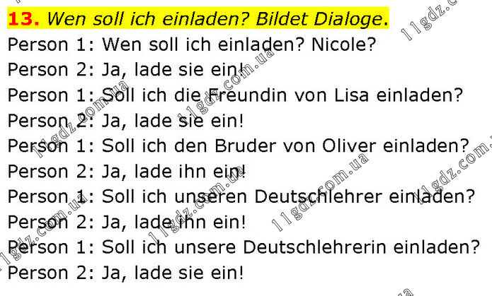 Wen soll ich einladen? Bildet Dialoge. Person 1: Wen soll ich einladen? Nicole? Person 2: Ja, lade sie ein! Person 1: Soll ich die Freundin von Lisa einladen? Person 2: Ja, lade sie ein! Person 1: Soll ich den Bruder von Oliver einladen? Person 2: Ja, lade ihn ein! Person 1: Soll ich unseren Deutschlehrer einladen? Person 2: Ja, lade ihn ein! Person 1: Soll ich unsere Deutschlehrerin einladen? Person 2: Ja, lade sie ein!