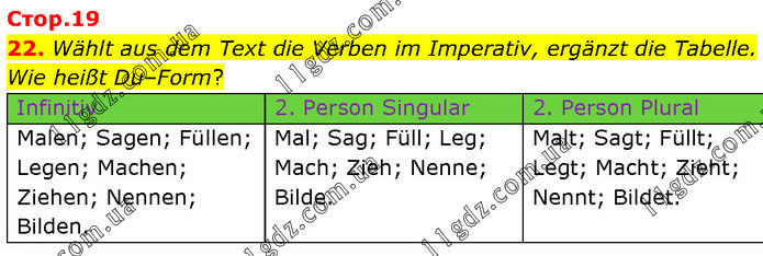 Wählt aus dem Text die Verben im Imperativ, ergänzt die Tabelle. Wie heißt Du–Form? Infinitiv 2. Person Singular 2. Person Plural Malen; Sagen; Füllen; Legen; Machen; Ziehen; Nennen; Bilden. Mal; Sag; Füll; Leg; Mach; Zieh; Nenne; Bilde. Malt; Sagt; Füllt; Legt; Macht; Zieht; Nennt; Bildet.