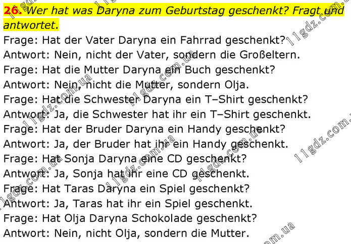 Wer hat was Daryna zum Geburtstag geschenkt? Fragt und antwortet. Frage: Hat der Vater Daryna ein Fahrrad geschenkt? Antwort: Nein, nicht der Vater, sondern die Großeltern. Frage: Hat die Mutter Daryna ein Buch geschenkt? Antwort: Nein, nicht die Mutter, sondern Olja. Frage: Hat die Schwester Daryna ein T–Shirt geschenkt? Antwort: Ja, die Schwester hat ihr ein T–Shirt geschenkt. Frage: Hat der Bruder Daryna ein Handy geschenkt? Antwort: Ja, der Bruder hat ihr ein Handy geschenkt. Frage: Hat Sonja Daryna eine CD geschenkt? Antwort: Ja, Sonja hat ihr eine CD geschenkt. Frage: Hat Taras Daryna ein Spiel geschenkt? Antwort: Ja, Taras hat ihr ein Spiel geschenkt. Frage: Hat Olja Daryna Schokolade geschenkt? Antwort: Nein, nicht Olja, sondern die Mutter.