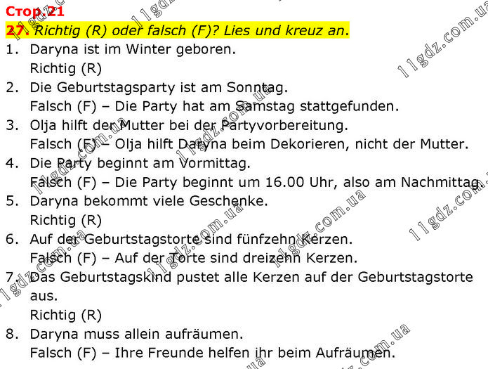 Richtig (R) oder falsch (F)? Lies und kreuz an. 1. Daryna ist im Winter geboren. Richtig (R) 2. Die Geburtstagsparty ist am Sonntag. Falsch (F) – Die Party hat am Samstag stattgefunden. 3. Olja hilft der Mutter bei der Partyvorbereitung. Falsch (F) – Olja hilft Daryna beim Dekorieren, nicht der Mutter. 4. Die Party beginnt am Vormittag. Falsch (F) – Die Party beginnt um 16.00 Uhr, also am Nachmittag. 5. Daryna bekommt viele Geschenke. Richtig (R) 6. Auf der Geburtstagstorte sind fünfzehn Kerzen. Falsch (F) – Auf der Torte sind dreizehn Kerzen. 7. Das Geburtstagskind pustet alle Kerzen auf der Geburtstagstorte aus. Richtig (R) 8. Daryna muss allein aufräumen. Falsch (F) – Ihre Freunde helfen ihr beim Aufräumen.