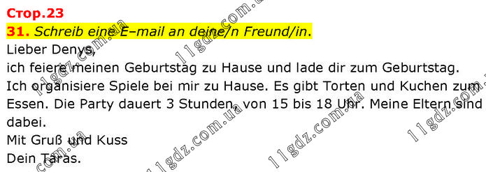 Schreib eine E–mail an deine/n Freund/in. Lieber Denys, ich feiere meinen Geburtstag zu Hause und lade dir zum Geburtstag. Ich organisiere Spiele bei mir zu Hause. Es gibt Torten und Kuchen zum Essen. Die Party dauert 3 Stunden, von 15 bis 18 Uhr. Meine Eltern sind dabei. Mit Gruß und Kuss Dein Taras.