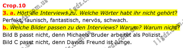 a. Hört die Interviews zu. Welche Wörter habt ihr nicht gehört? Perfekt, launisch, fantastisch, nervös, schwach. b. Welche Bilder passen zu den Interviews? Warum? Warum nicht? Bild B passt nicht, denn Michaels Bruder arbeitet als Polizist. Bild C passt nicht, denn Davids Freund ist Junge.