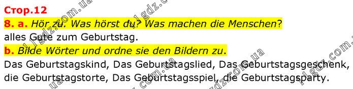 a. Hör zu. Was hörst du? Was machen die Menschen? alles Gute zum Geburtstag. b. Bilde Wörter und ordne sie den Bildern zu. Das Geburtstagskind, Das Geburtstagslied, Das Geburtstagsgeschenk, die Geburtstagstorte, Das Geburtstagsspiel, die Geburtstagsparty.