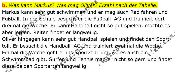 Was kann Markus? Was mag Oliver? Erzähl nach der Tabelle. Markus kann sehr gut schwimmen und er mag auch Rad fahren und Fußball. In der Schule besucht er die Fußball–AG und trainiert dort dreimal die Woche. Er kann Handball nicht so gut spielen, möchte es aber lernen. Reiten findet er langweilig. Oliver hingegen kann sehr gut Handball spielen und findet den Sport toll. Er besucht die Handball–AG und trainiert zweimal die Woche. Einmal die Woche geht er ins Sportzentrum, wo es auch ein Schwimmbad gibt. Surfen und Tennis mag er nicht so gern und findet diese beiden Sportarten langweilig.