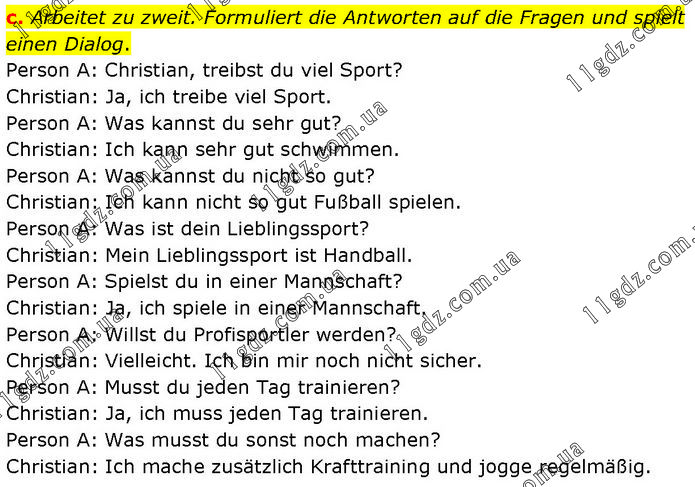 Arbeitet zu zweit. Formuliert die Antworten auf die Fragen und spielt einen Dialog. Person A: Christian, treibst du viel Sport? Christian: Ja, ich treibe viel Sport. Person A: Was kannst du sehr gut? Christian: Ich kann sehr gut schwimmen. Person A: Was kannst du nicht so gut? Christian: Ich kann nicht so gut Fußball spielen. Person A: Was ist dein Lieblingssport? Christian: Mein Lieblingssport ist Handball. Person A: Spielst du in einer Mannschaft? Christian: Ja, ich spiele in einer Mannschaft. Person A: Willst du Profisportler werden? Christian: Vielleicht. Ich bin mir noch nicht sicher. Person A: Musst du jeden Tag trainieren? Christian: Ja, ich muss jeden Tag trainieren. Person A: Was musst du sonst noch machen? Christian: Ich mache zusätzlich Krafttraining und jogge regelmäßig.