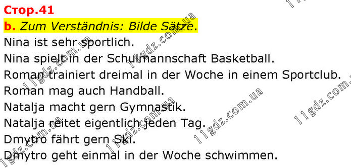Zum Verständnis: Bilde Sätze. Nina ist sehr sportlich. Nina spielt in der Schulmannschaft Basketball. Roman trainiert dreimal in der Woche in einem Sportclub. Roman mag auch Handball. Natalja macht gern Gymnastik. Natalja reitet eigentlich jeden Tag. Dmytro fährt gern Ski. Dmytro geht einmal in der Woche schwimmen.