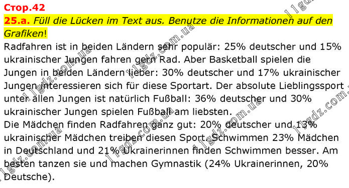 Füll die Lücken im Text aus. Benutze die Informationen auf den Grafiken! Radfahren ist in beiden Ländern sehr populär: 25% deutscher und 15% ukrainischer Jungen fahren gern Rad. Aber Basketball spielen die Jungen in beiden Ländern lieber: 30% deutscher und 17% ukrainischer Jungen interessieren sich für diese Sportart. Der absolute Lieblingssport unter allen Jungen ist natürlich Fußball: 36% deutscher und 30% ukrainischer Jungen spielen Fußball am liebsten. Die Mädchen finden Radfahren ganz gut: 20% deutscher und 13% ukrainischer Mädchen treiben diesen Sport. Schwimmen 23% Mädchen in Deutschland und 21% Ukrainerinnen finden Schwimmen besser. Am besten tanzen sie und machen Gymnastik (24% Ukrainerinnen, 20% Deutsche).