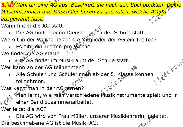 Wähl dir eine AG aus. Beschreib sie nach den Stichpunkten. Deine Mitschülerinnen und Mitschüler hören zu und raten, welche AG du ausgewählt hast. Wann findet die AG statt? • Die AG findet jeden Dienstag nach der Schule statt. Wie oft in der Woche haben die Mitglieder der AG ein Treffen? • Es gibt ein Treffen pro Woche. Wo findet die AG statt? • Die AG findet im Musikraum der Schule statt. Wer kann an der AG teilnehmen? • Alle Schüler und Schülerinnen ab der 5. Klasse können teilnehmen. Was kann man in der AG lernen? • Man lernt, wie man verschiedene Musikinstrumente spielt und in einer Band zusammenarbeitet. Wer leitet die AG? • Die AG wird von Frau Müller, unserer Musiklehrerin, geleitet. Die beschriebene AG ist die Musik–AG.