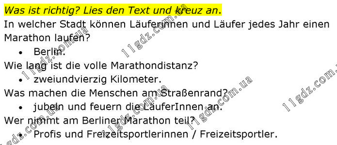 Was ist richtig? Lies den Text und kreuz an. In welcher Stadt können Läuferinnen und Läufer jedes Jahr einen Marathon laufen? • Berlin. Wie lang ist die volle Marathondistanz? • zweiundvierzig Kilometer. Was machen die Menschen am Straßenrand? • jubeln und feuern die LäuferInnen an. Wer nimmt am Berliner Marathon teil? • Profis und Freizeitsportlerinnen / Freizeitsportler.