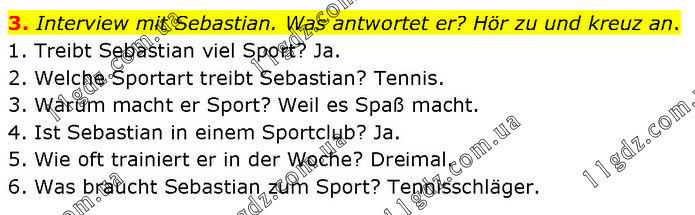Interview mit Sebastian. Was antwortet er? Hör zu und kreuz an. 1. Treibt Sebastian viel Sport? Ja. 2. Welche Sportart treibt Sebastian? Tennis. 3. Warum macht er Sport? Weil es Spaß macht. 4. Ist Sebastian in einem Sportclub? Ja. 5. Wie oft trainiert er in der Woche? Dreimal. 6. Was braucht Sebastian zum Sport? Tennisschläger.