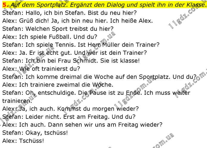 Auf dem Sportplatz. Ergänzt den Dialog und spielt ihn in der Klasse. Stefan: Hallo, ich bin Stefan. Bist du neu hier? Alex: Grüß dich! Ja, ich bin neu hier. Ich heiße Alex. Stefan: Welchen Sport treibst du hier? Alex: Ich spiele Fußball. Und du? Stefan: Ich spiele Tennis. Ist Herr Müller dein Trainer? Alex: Ja. Er ist echt gut. Und wer ist dein Trainer? Stefan: Ich bin bei Frau Schmidt. Sie ist klasse! Alex: Wie oft trainierst du? Stefan: Ich komme dreimal die Woche auf den Sportplatz. Und du? Alex: Ich trainiere zweimal die Woche. Stefan: Oh, entschuldige. Die Pause ist zu Ende. Ich muss weiter trainieren. Alex: Ja, ich auch. Kommst du morgen wieder? Stefan: Leider nicht. Erst am Freitag. Und du? Alex: Ich auch. Dann sehen wir uns am Freitag wieder? Stefan: Okay, tschüss! Alex: Tschüss!