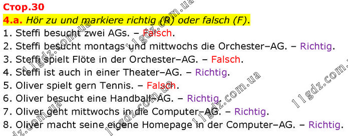 4.a. Hör zu und markiere richtig (R) oder falsch (F). 1. Steffi besucht zwei AGs. – Falsch. 2. Steffi besucht montags und mittwochs die Orchester–AG. – Richtig. 3. Steffi spielt Flöte in der Orchester–AG. – Falsch. 4. Steffi ist auch in einer Theater–AG. – Richtig. 5. Oliver spielt gern Tennis. – Falsch. 6. Oliver besucht eine Handball–AG. – Richtig. 7. Oliver geht mittwochs in die Computer–AG. – Richtig. 8. Oliver macht seine eigene Homepage in der Computer–AG. – Richtig.