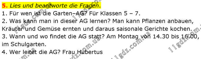 Lies und beantworte die Fragen. 1. Für wen ist die Garten–AG? Für Klassen 5 – 7. 2. Was kann man in dieser AG lernen? Man kann Pflanzen anbauen, Kräuter und Gemüse ernten und daraus saisonale Gerichte kochen. 3. Wann und wo findet die AG statt? Am Montag von 14.30 bis 16.00, im Schulgarten. 4. Wer leitet die AG? Frau Hubertus