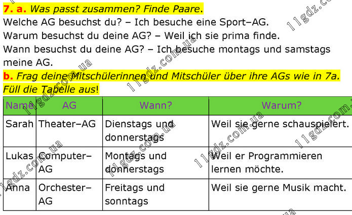 7. a. Was passt zusammen? Finde Paare. Welche AG besuchst du? – Ich besuche eine Sport–AG. Warum besuchst du deine AG? – Weil ich sie prima finde. Wann besuchst du deine AG? – Ich besuche montags und samstags meine AG. b. Frag deine Mitschülerinnen und Mitschüler über ihre AGs wie in 7a. Füll die Tabelle aus! Name AG Wann? Warum? Sarah Theater–AG Dienstags und donnerstags Weil sie gerne schauspielert. Lukas Computer–AG Montags und donnerstags Weil er Programmieren lernen möchte. Anna Orchester–AG Freitags und sonntags Weil sie gerne Musik macht.