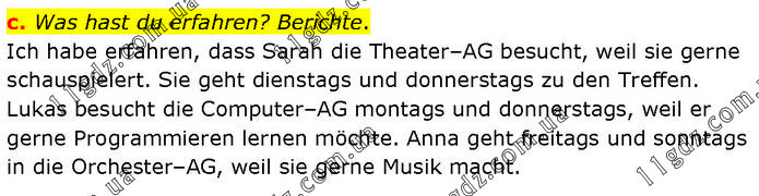 Was hast du erfahren? Berichte. Ich habe erfahren, dass Sarah die Theater–AG besucht, weil sie gerne schauspielert. Sie geht dienstags und donnerstags zu den Treffen. Lukas besucht die Computer–AG montags und donnerstags, weil er gerne Programmieren lernen möchte. Anna geht freitags und sonntags in die Orchester–AG, weil sie gerne Musik macht.