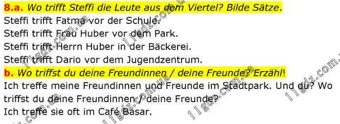8.a. Wo trifft Steffi die Leute aus dem Viertel? Bilde Sätze. Steffi trifft Fatma vor der Schule. Steffi trifft Frau Huber vor dem Park. Steffi trifft Herrn Huber in der Bäckerei. Steffi trifft Dario vor dem Jugendzentrum. b. Wo triffst du deine Freundinnen / deine Freunde? Erzähl! Ich treffe meine Freundinnen und Freunde im Stadtpark. Und du? Wo triffst du deine Freundinnen / deine Freunde? Ich treffe sie oft im Café Basar.
