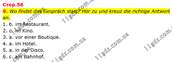 Wo findet das Gespräch statt? Hör zu und kreuz die richtige Antwort an. 1. b. im Restaurant. 2. c. im Kino. 3. a. vor einer Boutique. 4. a. im Hotel. 5. a. in der Disco. 6. c. am Bahnhof.