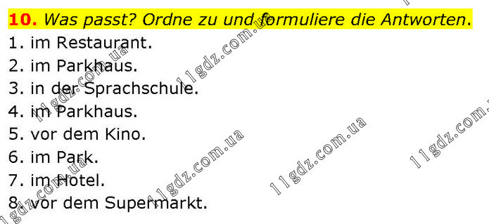 Was passt? Ordne zu und formuliere die Antworten. 1. im Restaurant. 2. im Parkhaus. 3. in der Sprachschule. 4. im Parkhaus. 5. vor dem Kino. 6. im Park. 7. im Hotel. 8. vor dem Supermarkt.