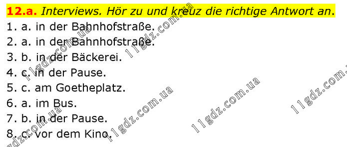 12.a. Interviews. Hör zu und kreuz die richtige Antwort an. 1. a. in der Bahnhofstraße. 2. a. in der Bahnhofstraße. 3. b. in der Bäckerei. 4. c. in der Pause. 5. c. am Goetheplatz. 6. a. im Bus. 7. b. in der Pause. 8. c. vor dem Kino.
