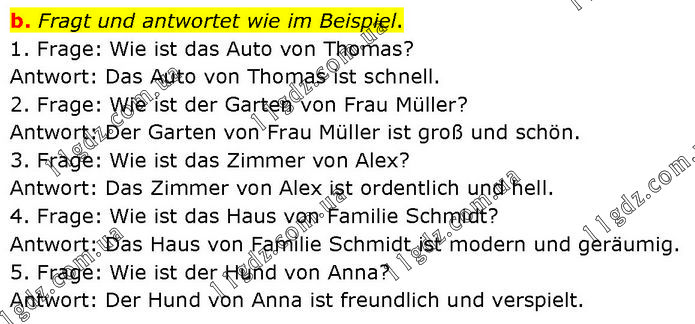 b. Fragt und antwortet wie im Beispiel. 1. Frage: Wie ist das Auto von Thomas? Antwort: Das Auto von Thomas ist schnell. 2. Frage: Wie ist der Garten von Frau Müller? Antwort: Der Garten von Frau Müller ist groß und schön. 3. Frage: Wie ist das Zimmer von Alex? Antwort: Das Zimmer von Alex ist ordentlich und hell. 4. Frage: Wie ist das Haus von Familie Schmidt? Antwort: Das Haus von Familie Schmidt ist modern und geräumig. 5. Frage: Wie ist der Hund von Anna? Antwort: Der Hund von Anna ist freundlich und verspielt.