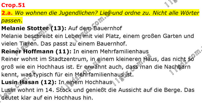 2.a. Wo wohnen die Jugendlichen? Lies und ordne zu. Nicht alle Wörter passen. Melanie Stotter (13): Auf dem Bauernhof Melanie beschreibt ein Leben mit viel Platz, einem großen Garten und vielen Tieren. Das passt zu einem Bauernhof. Reiner Hoffmann (11): In einem Mehrfamilienhaus Reiner wohnt im Stadtzentrum, in einem kleineren Haus, das nicht so groß wie ein Hochhaus ist. Er erwähnt auch, dass man die Nachbarn kennt, was typisch für ein Mehrfamilienhaus ist. Lusin Hasan (12): In einem Hochhaus Lusin wohnt im 14. Stock und genießt die Aussicht auf die Berge. Das deutet klar auf ein Hochhaus hin.