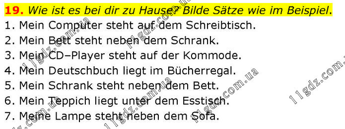 Wie ist es bei dir zu Hause? Bilde Sätze wie im Beispiel. 1. Mein Computer steht auf dem Schreibtisch. 2. Mein Bett steht neben dem Schrank. 3. Mein CD–Player steht auf der Kommode. 4. Mein Deutschbuch liegt im Bücherregal. 5. Mein Schrank steht neben dem Bett. 6. Mein Teppich liegt unter dem Esstisch. 7. Meine Lampe steht neben dem Sofa.