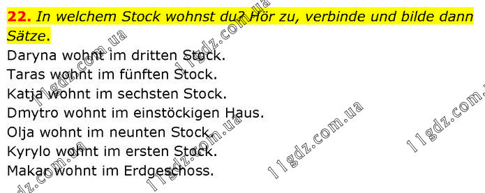 In welchem Stock wohnst du? Hör zu, verbinde und bilde dann Sätze. Daryna wohnt im dritten Stock. Taras wohnt im fünften Stock. Katja wohnt im sechsten Stock. Dmytro wohnt im einstöckigen Haus. Olja wohnt im neunten Stock. Kyrylo wohnt im ersten Stock. Makar wohnt im Erdgeschoss.