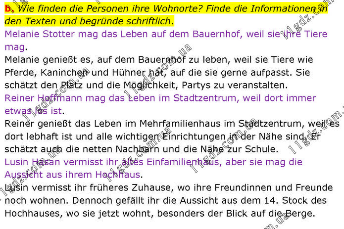 Wie finden die Personen ihre Wohnorte? Finde die Informationen in den Texten und begründe schriftlich. Melanie Stotter mag das Leben auf dem Bauernhof, weil sie ihre Tiere mag. Melanie genießt es, auf dem Bauernhof zu leben, weil sie Tiere wie Pferde, Kaninchen und Hühner hat, auf die sie gerne aufpasst. Sie schätzt den Platz und die Möglichkeit, Partys zu veranstalten. Reiner Hoffmann mag das Leben im Stadtzentrum, weil dort immer etwas los ist. Reiner genießt das Leben im Mehrfamilienhaus im Stadtzentrum, weil es dort lebhaft ist und alle wichtigen Einrichtungen in der Nähe sind. Er schätzt auch die netten Nachbarn und die Nähe zur Schule. Lusin Hasan vermisst ihr altes Einfamilienhaus, aber sie mag die Aussicht aus ihrem Hochhaus. Lusin vermisst ihr früheres Zuhause, wo ihre Freundinnen und Freunde noch wohnen. Dennoch gefällt ihr die Aussicht aus dem 14. Stock des Hochhauses, wo sie jetzt wohnt, besonders der Blick auf die Berge.