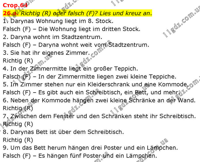 26.a. Richtig (R) oder falsch (F)? Lies und kreuz an. 1. Darynas Wohnung liegt im 8. Stock. Falsch (F) – Die Wohnung liegt im dritten Stock. 2. Daryna wohnt im Stadtzentrum. Falsch (F) – Daryna wohnt weit vom Stadtzentrum. 3. Sie hat ihr eigenes Zimmer. Richtig (R) 4. In der Zimmermitte liegt ein großer Teppich. Falsch (F) – In der Zimmermitte liegen zwei kleine Teppiche. 5. Im Zimmer stehen nur ein Kleiderschrank und eine Kommode. Falsch (F) – Es gibt auch ein Schreibtisch, ein Bett, und mehr. 6. Neben der Kommode hängen zwei kleine Schränke an der Wand. Richtig (R) 7. Zwischen dem Fenster und den Schränken steht ihr Schreibtisch. Richtig (R) 8. Darynas Bett ist über dem Schreibtisch. Richtig (R) 9. Um das Bett herum hängen drei Poster und ein Lämpchen. Falsch (F) – Es hängen fünf Poster und ein Lämpchen.