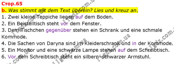 b. Was stimmt mit dem Text überein? Lies und kreuz an. 1. Zwei kleine Teppiche liegen auf dem Boden. 2. Ein Beistelltisch steht vor dem Fenster. 3. Dem Tischchen gegenüber stehen ein Schrank und eine schmale Kommode. 4. Die Sachen von Daryna sind im Kleiderschrank und in der Kommode. 5. Ein Monitor und eine schwarze Lampe stehen auf dem Schreibtisch. 6. Vor dem Schreibtisch steht ein silbern–schwarzer Armstuhl.