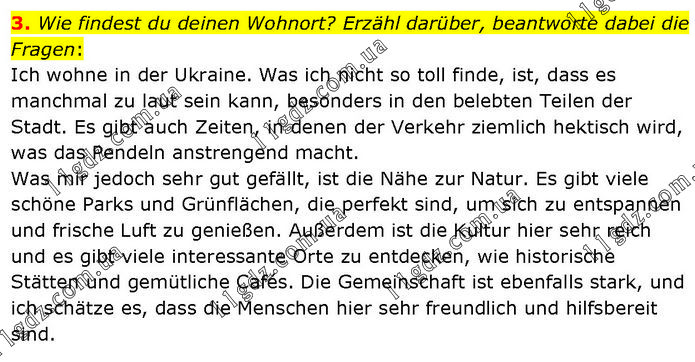 Wie findest du deinen Wohnort? Erzähl darüber, beantworte dabei die Fragen: Ich wohne in der Ukraine. Was ich nicht so toll finde, ist, dass es manchmal zu laut sein kann, besonders in den belebten Teilen der Stadt. Es gibt auch Zeiten, in denen der Verkehr ziemlich hektisch wird, was das Pendeln anstrengend macht. Was mir jedoch sehr gut gefällt, ist die Nähe zur Natur. Es gibt viele schöne Parks und Grünflächen, die perfekt sind, um sich zu entspannen und frische Luft zu genießen. Außerdem ist die Kultur hier sehr reich und es gibt viele interessante Orte zu entdecken, wie historische Stätten und gemütliche Cafés. Die Gemeinschaft ist ebenfalls stark, und ich schätze es, dass die Menschen hier sehr freundlich und hilfsbereit sind.