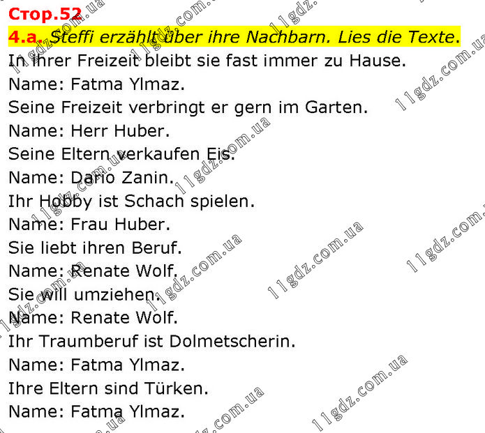 4.a. Steffi erzählt über ihre Nachbarn. Lies die Texte. In ihrer Freizeit bleibt sie fast immer zu Hause. Name: Fatma Ylmaz. Seine Freizeit verbringt er gern im Garten. Name: Herr Huber. Seine Eltern verkaufen Eis. Name: Dario Zanin. Ihr Hobby ist Schach spielen. Name: Frau Huber. Sie liebt ihren Beruf. Name: Renate Wolf. Sie will umziehen. Name: Renate Wolf. Ihr Traumberuf ist Dolmetscherin. Name: Fatma Ylmaz. Ihre Eltern sind Türken. Name: Fatma Ylmaz.