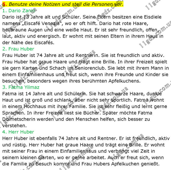Benutze deine Notizen und stell die Personen vor. 1. Dario Zanin Dario ist 13 Jahre alt und Schüler. Seine Eltern besitzen eine Eisdiele namens „Eiscafé Venezia“, wo er oft hilft. Dario hat rote Haare, hellbraune Augen und eine weiße Haut. Er ist sehr freundlich, offen, laut, aktiv und energisch. Er wohnt mit seinen Eltern in ihrem Haus in der Nähe des Eiscafés. 2. Frau Huber Frau Huber ist 74 Jahre alt und Rentnerin. Sie ist freundlich und aktiv. Frau Huber hat graue Haare und trägt eine Brille. In ihrer Freizeit spielt sie gern Karten und Schach im Seniorenclub. Sie lebt mit ihrem Mann in einem Einfamilienhaus und freut sich, wenn ihre Freunde und Kinder sie besuchen, besonders wegen ihres berühmten Apfelkuchens. 3. Fatma Yilmaz Fatma ist 14 Jahre alt und Schülerin. Sie hat schwarze Haare, dunkle Haut und ist groß und schlank, aber nicht sehr sportlich. Fatma wohnt in einem Hochhaus mit ihrer Familie. Sie ist sehr fleißig und lernt gerne Sprachen. In ihrer Freizeit liest sie Bücher. Später möchte Fatma Dolmetscherin werden und den Menschen helfen, sich besser zu verstehen. 4. Herr Huber Herr Huber ist ebenfalls 74 Jahre alt und Rentner. Er ist freundlich, aktiv und rüstig. Herr Huber hat graue Haare und trägt eine Brille. Er wohnt mit seiner Frau in einem Einfamilienhaus und verbringt viel Zeit in seinem kleinen Garten, wo er gerne arbeitet. Auch er freut sich, wenn die Familie zu Besuch kommt und Frau Hubers Apfelkuchen genießt.